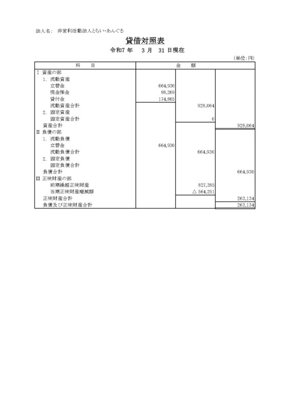 お知らせ 投稿日: 2025年7月23日2026年3月17日 投稿者: 編集者 【ご報告】2024年度特定非営利活動法人とらい・あんぐる賃借対照表 特定非営利活動法人とらい・あんぐるの2024年度「賃借対照表」をご報告いたします。