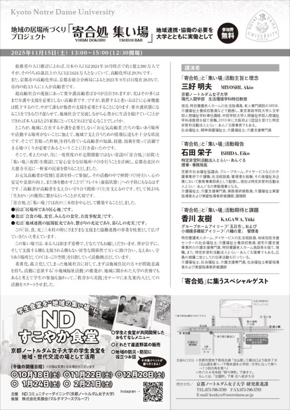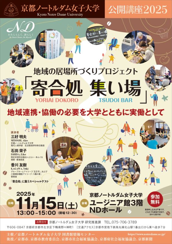三好理事長の勤務校である京都ノートルダム女子大学において、2025年度の公開講座で地域の居場所作りプロジェクト『寄合処 集い場』をテーマにお話をします。現在進行形の取り組みではございますが、この半年の活動を通して得たこと、気づいたこと、見えてきた課題などをお伝えできればと思っています。ぜひ、お越しくださいませ。