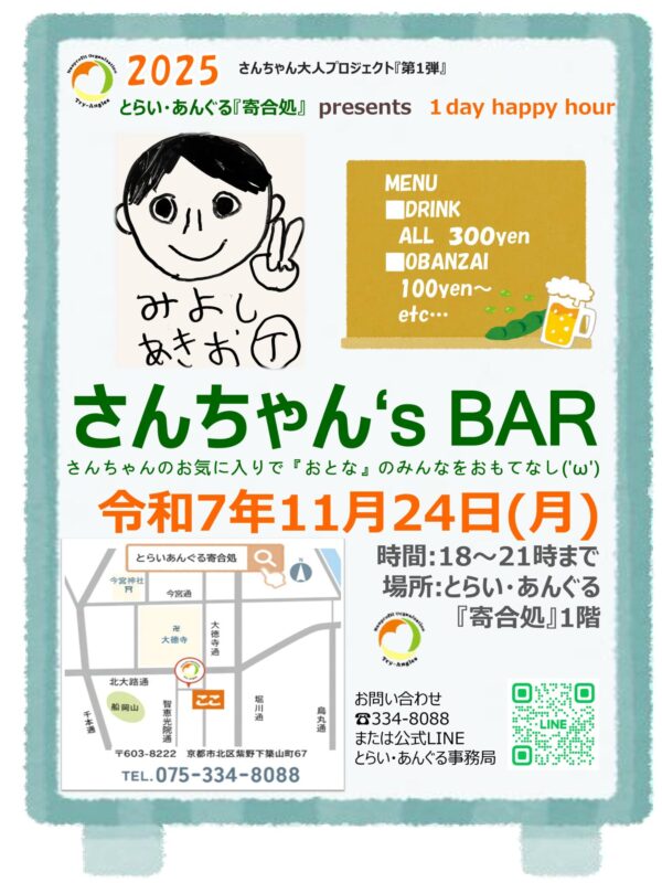 同日、18時から「さんちゃん’S BAR」開店♪ 11月からは、場所をとらい・あんぐる『寄合処』1階となります!