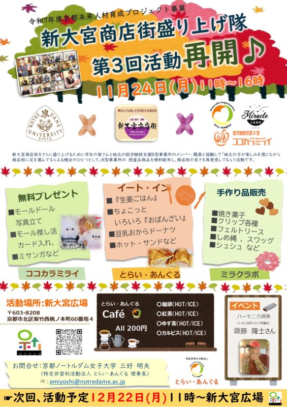 三好理事長の勤務校である京都ノートルダム女子大学、生活環境学科三好ゼミにおいて、京都府の「令和7年度京都未来人材育成プロジェクト事業」の申請を行い、京都府西脇知事により補助金交付の通知をいただいた『新大宮商店街盛り上げ隊』が11月24日月曜日11時から活動します!活動メンバー大募集中です。一緒に盛り上げていきましょう♪