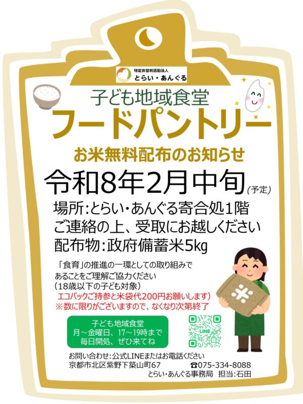 お知らせ 投稿日: 2025年12月26日 投稿者: 編集者 とらい・あんぐる『子ども地域食堂』フードパントリーお米の無料配布第2回目申請しました! 政府備蓄米の無料交付申請第2回目を行いました。前回、お渡しできなかった子どもさん、ご家族を優先してお渡しいたします。届き次第、ホームページ、公式LINE,Googleマップのオーナー提供などでご案内させて頂きます!