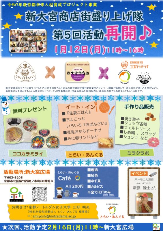 三好理事長の勤務校である京都ノートルダム女子大学、生活環境学科三好ゼミにおいて、京都府の「令和7年度京都未来人材育成プロジェクト事業」の申請を行い、京都府西脇知事により補助金交付の通知をいただいた『新大宮商店街盛り上げ隊』が1月12日月曜日11時から活動します!活動メンバー大募集中です。一緒に盛り上げていきましょう♪